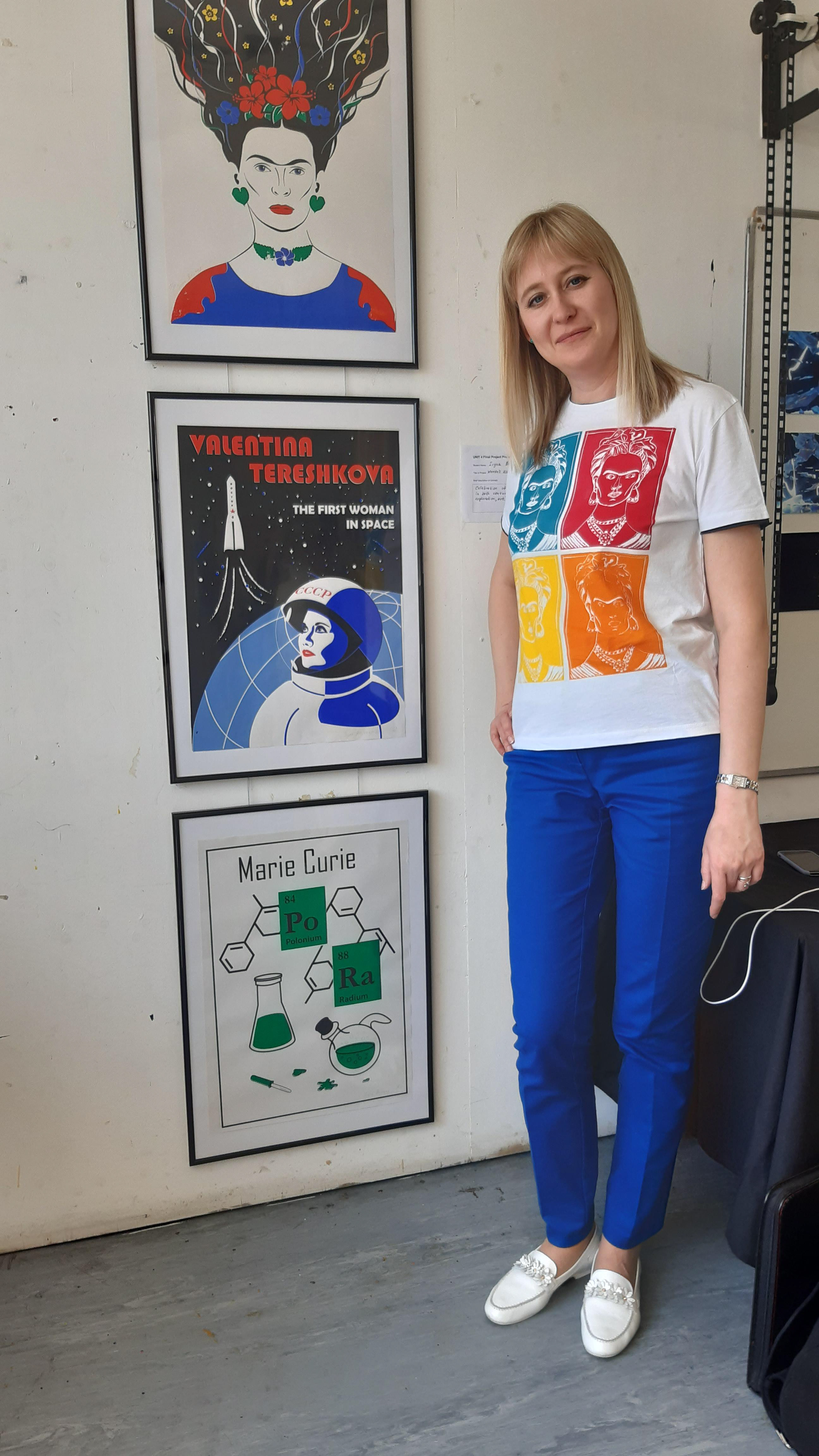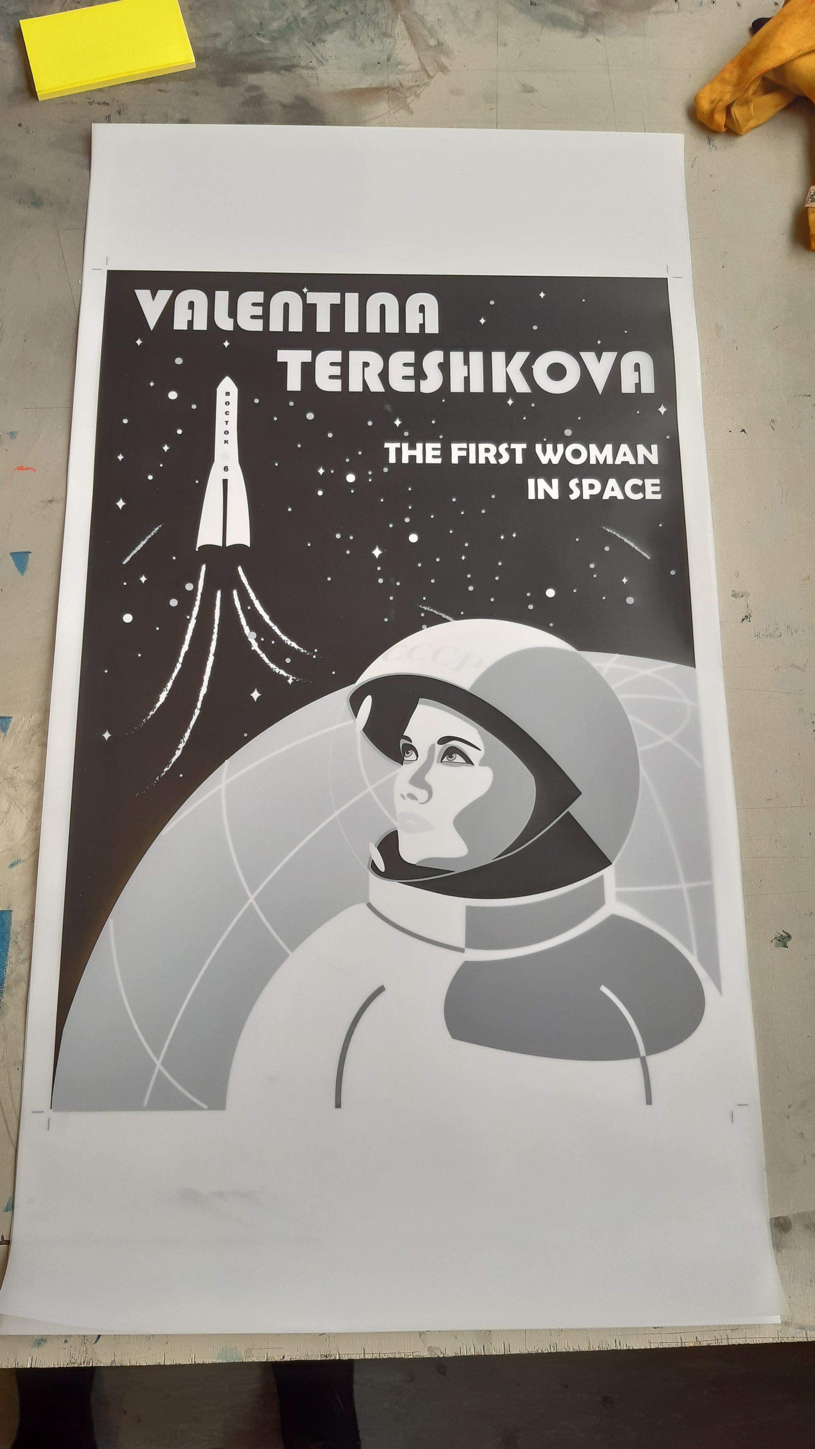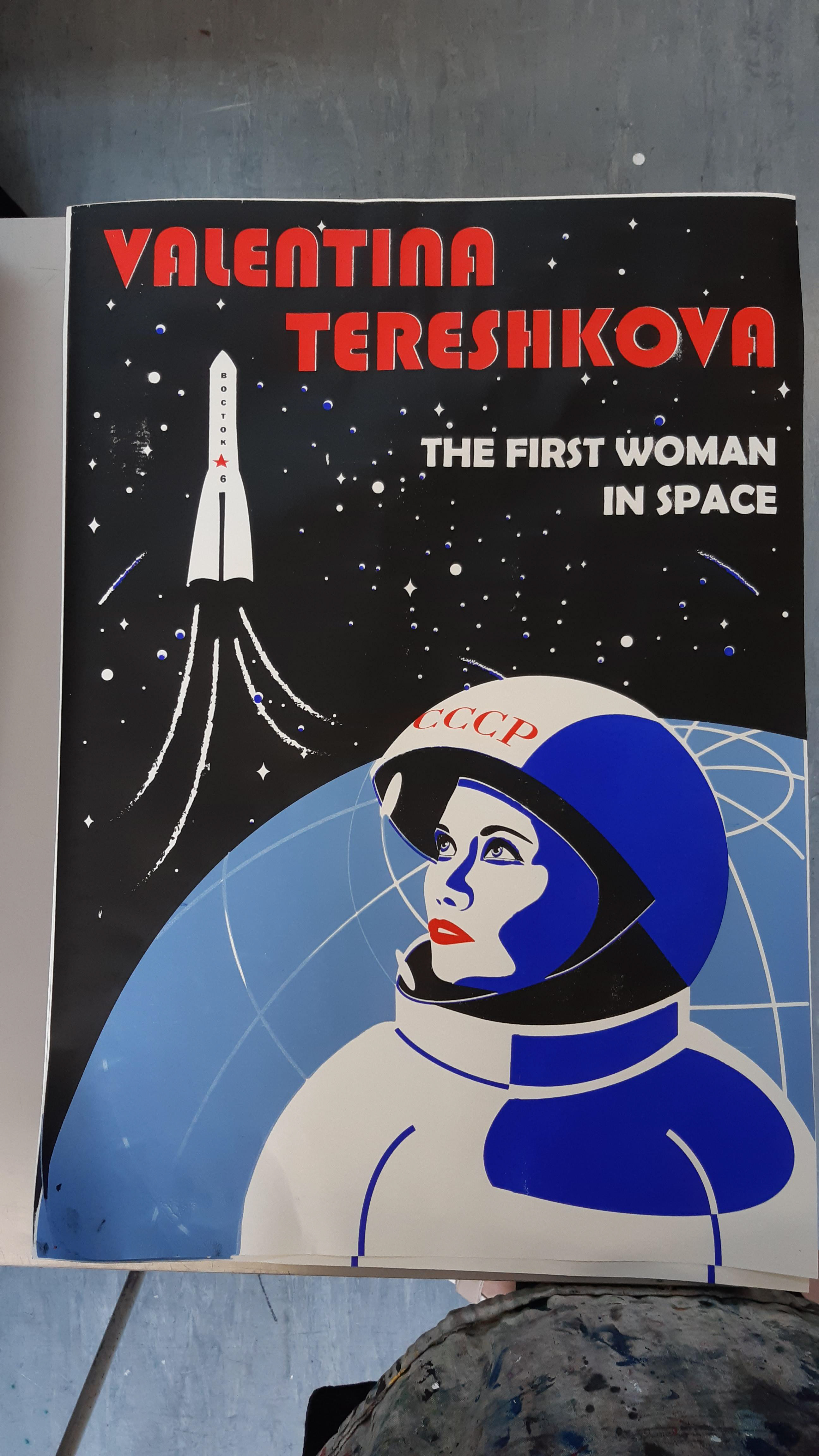The project involved the design of screen-printed posters celebrating women’s achievements in science, featuring the first woman in space.